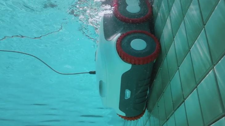 This robot can handle pools up to 3m deep. It is compatible with cement, fiberglass, and vinyl surfaces. It comes with over 12 sensors for obstacle detection.
