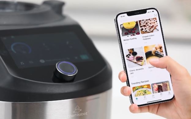 This is the ChefRobot CR-8: a WiFi connected kitchen that you can use to stir-fry, grind, knead, stew, and steam your food. It has a 7-inch touchscreen display and a weighing scale. This appliance can replace your blender, rice cooker, stand mixer, meat grinder, and slow cooker. It combines with your phone to let you easily try new recipes.