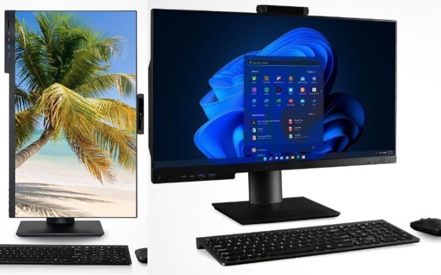 This all-in-one PC has a footprint of 23.2 x 24″. The display has an adjustable tilt and height. This PC has a vertical mode. You can find out more about it here.