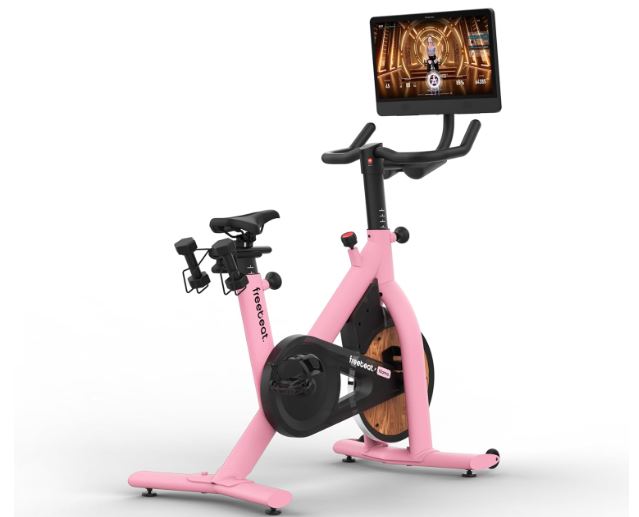 This is the Freebeat Lit Exercise Bike: a smart bike with a 21.5-inch display, Bluetooth connectivity, and auto resistance that gives you an interactive workouts. It comes with smart saddle detection, so it can detect in and out of saddle riding. This bike has an elegant design with a wood covered flywheel.