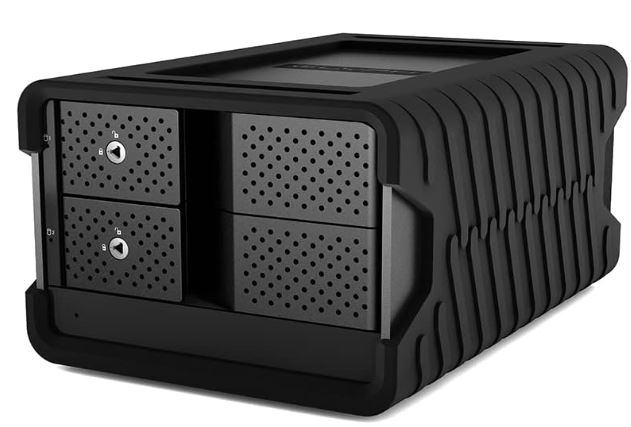 Meet the Glyph Blackbox PRO 40TB RAID Array: a storage system with 2 bays that you can use for 20TB hard drives. It has 2 x Thunderbolt 3 ports. It has RAID 0, 1, JBOD, and SPAN modes. You can daisy chain up to 5 of these with a single cable to your computer. You can also attach a 4K monitor