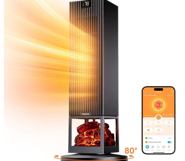 Meet the GoveeLife Smart Space Heater Max: an Alexa and Google Assistant compatible heater that keeps you warm on cold winter days and nights. It has a noise rating of 45dB in low mode. It also has an adjustable 360-degree panoramic fireplace light. It heats in 2 seconds thanks to PTC ceramic tech.
