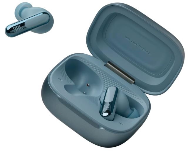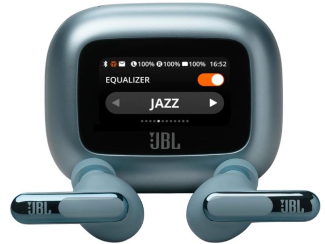 This is the JBL Live Beam 3: true wireless noise-cancelling earbuds with 6 mics that that deliver rich sound while reducing wind and noise interference. You can customize these through your smartphone. These also have a smart charging case with a 1.45-inch touchscreen display. These last up to 12 hours on battery, which is extended to 48 hours with the charging case.