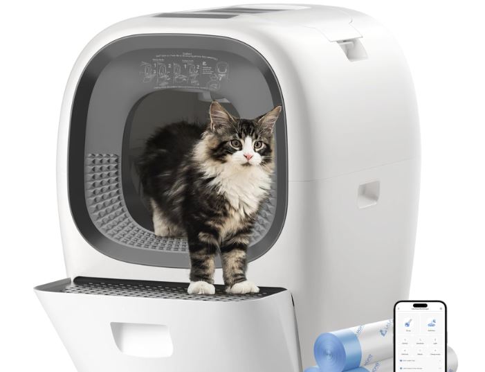This is the LALAHOME RealScooper: an app connected self cleaning cat litter box with 5/2.4GHz WiFi support that provides you with hands-free cleaning up to 14 days. It stores up to 6kg of clumping litter and dispenses 1.2kg when needed. This self-cleaning litter box has a 8L trash bin.