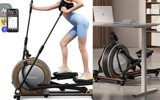 Meet the MERACH E12: a Bluetooth enabled elliptical machine with 16 levels of magnetic resistance that gives you a low impact workout. It has 3 modes, including a climbing mode that puts the focus on your glutes. You can also remove the handrails to put it under your desk.