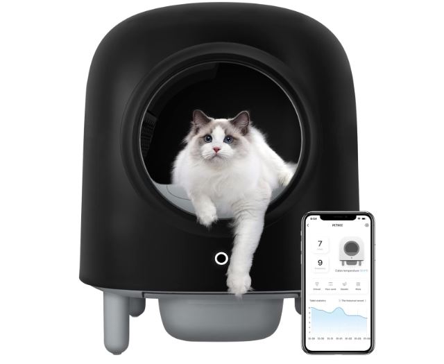 This is the Pettopia Self-Cleaning Cat Litter Box: a WiFi connected robot that cleans your pet’s waste, so you don’t have to. It comes with app connectivity, so you can monitor everything on your phone. It not only comes with automatic cleaning but also health monitoring. This smart litter box has a noise rating of 40dB.