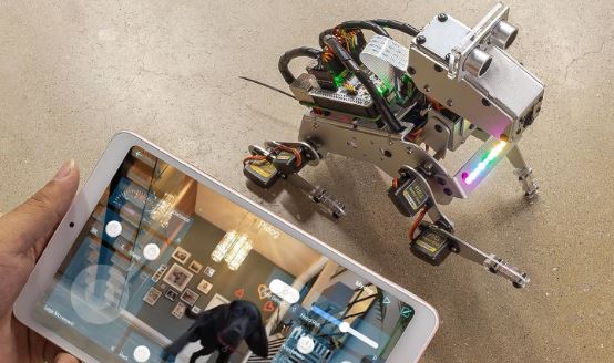 This robot comes with app and FPV control. It can stretch, scratch its ears, stroll, and wag its tail. It is ready for Python programming. You can find out more about it here.