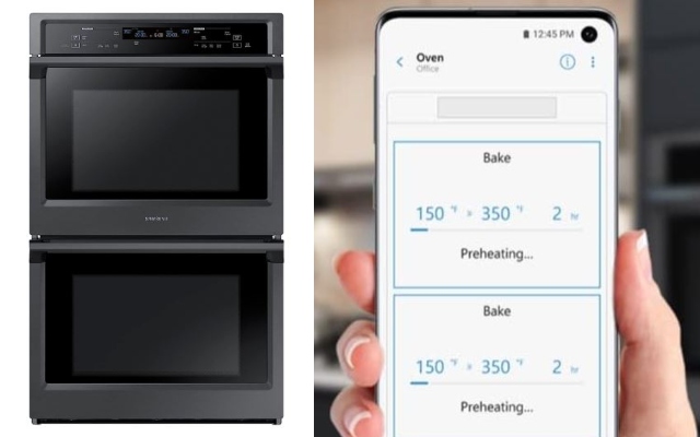Here is a double wall oven with WiFi and Voice control. The Samsung NV51K6650DG/AA Double Wall Oven with Steam Cook delivers the right amount of moisture at the right times to make juicy interior and crispy exterior meals. You can monitor and adjust cooking them on your smartphone using the SmartThings app.