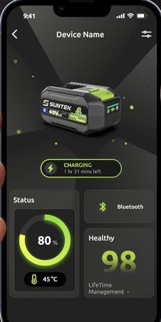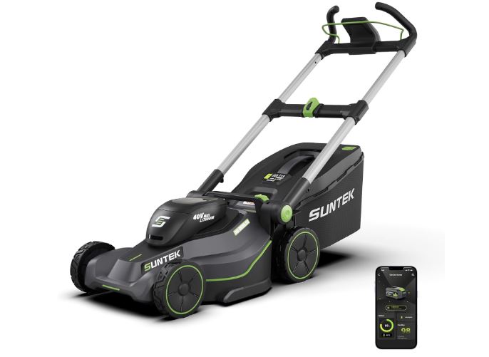 Here is an electric lawn mower that combines with your smartphone for easy battery monitoring. The SUNTEK 18-inch Electric Lawn Mower has digi-brushless motors. It has a smart screen that shows real-time information on battery and potential issues. The battery lasts up to 30 minutes.