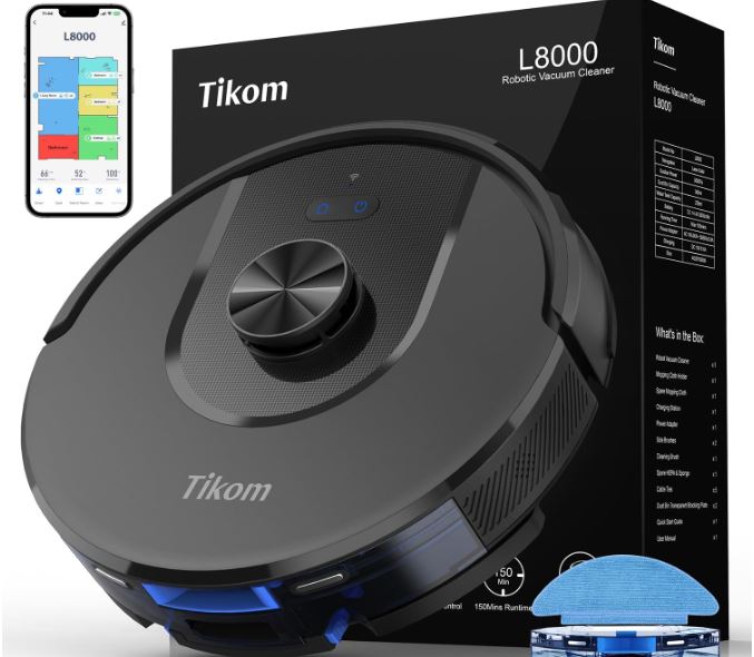 Tikom is one of the most underrated robotic brands that we have tested. It makes cheap robots with LiDAR that can map your home and clean it. The Tikom L8000 is a 3000Pa suction robot with LiDAR navigation, 14 no-go zones and 20 virtual walls. It lets you store up to 5 maps. It is smart enough to increase suction on carpets for deeper cleaning.