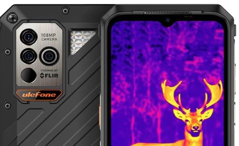 This is the Ulefone Power Armor 18T Ultra: a rugged Android smartphone with a thermal camera built-in. It has a 6.58-inch display with 9600mAh battery life. It has 24GB RAM and 512GB of storage space. It has a 108P main camera with a 32MP front camera, and a FLIR Lepton 3.5 thermal imager.