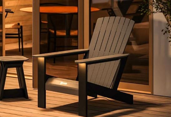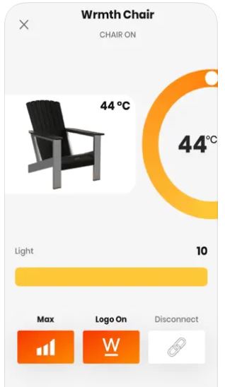 This is the Wrmth Muskoka: an app controlled heated chair that keeps you comfortable on chilly days. This Adirondack style heated chair has a modified stone body and aluminum powder coated legs. It combines with your phone to let you adjust temperature, schedule, and other settings.